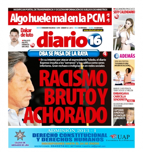 “Racismo, bruto y achorado”. El título es lanzado por Diario 16 y están dirigidas a los colegas del vespertino Expreso, quienes tuvieron frases racistas contra el exjefe de Estado, Alejandro Toledo, y los pobladores de la serranía peruana.