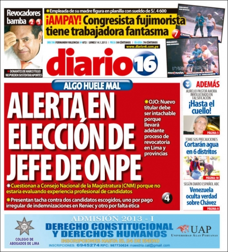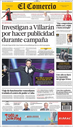 Entre los temas más importantes que presenta la prensa escrita peruana para hoy lunes 14 de enero, se encuentra la investigación que el Jurado Electoral Especial de Lima Centro (JEELC) le abrió a la alcaldesa de Lima, Susana Villarán, por una presunta violación de las leyes relativas a la publicidad estatal en etapas de elecciones.
