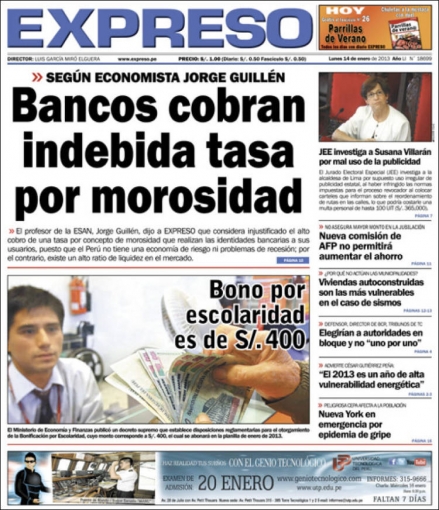 Finalizamos este recorrido con Expreso, que ofrece un reportaje sobre el alto cobro de morosidad que exigen las entidades bancarias a los usuarios, lo que a opinión de un catedrático universitario está perjudicando la economía de estos últimos; mientras que La Primera también toca el polémico caso del congresista fujimorista Aldo Bardales.