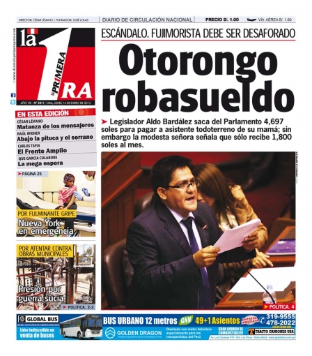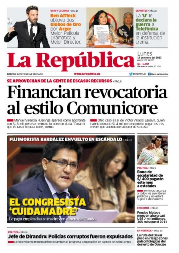 “El congresista cuidamadre”. El título pertenece a la primera hoja de La República y va dedicado a Aldo Bardález. Este Padre de la Patria, representante de la bancada fujimorista Fuerza 2011, contrató a Elina Yépez como coordinadora de su despacho congresal; sin embargo, grande fue la sorpresa al comprobar que también es la asistente personal de la madre del primero.