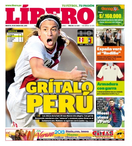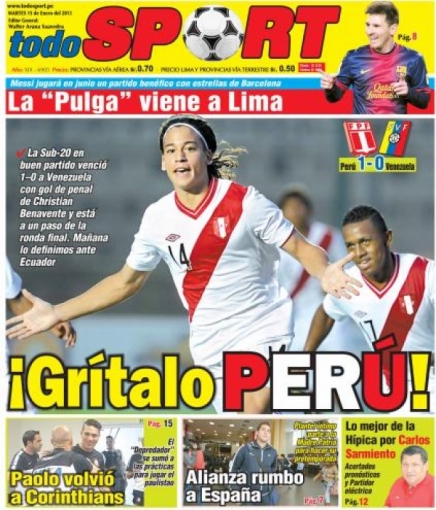 Los principales diarios deportivos del país informan en sus portadas de hoy martes 15 de enero, sobre la victoria de la selección peruana de fútbol por 1 a 0 sobre el combinado de Venezuela, en el Torneo Sub 20 que se viene celebrando en Argentina.