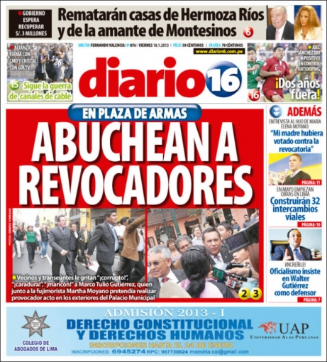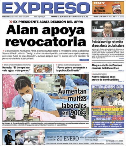 Entre los temas más importantes que muestra la prensa escrita peruana para hoy viernes 18 de enero, se encuentra la decisión del expresidente de la República, Alan García, de apoyar la campaña de revocatoria contra la alcaldesa de Lima, Susana Villarán, tal como anunció el Partido Aprista Peruano, agrupación que precisamente encabeza.