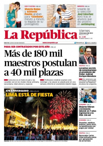 Por su parte, el vespertino La República expresa su preocupación por el sector educación. Cerca de 180 mil profesores se someterán a un examen este domingo 20 de enero, con la finalidad de alcanzar una de las 39 mil 865 plazas que ha puesto a disposición el Ministerio de Educación (Minedu).