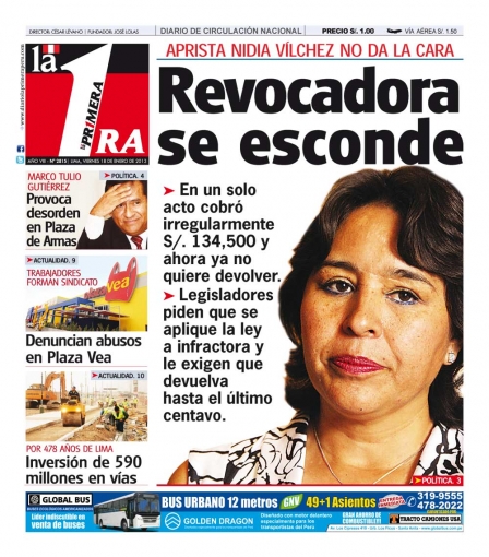Finalizamos este recorrido con el decano de la prensa peruana, El Comercio, que ofrece una evaluación de los últimos cambios que efectuó Susana Villarán en su equipo de trabajo, con miras al proceso de revocatoria en su contra; mientras que La Primera cede importancia a lo ocurrido con Marco Tulio Gutiérrez en el Centro de Lima.
