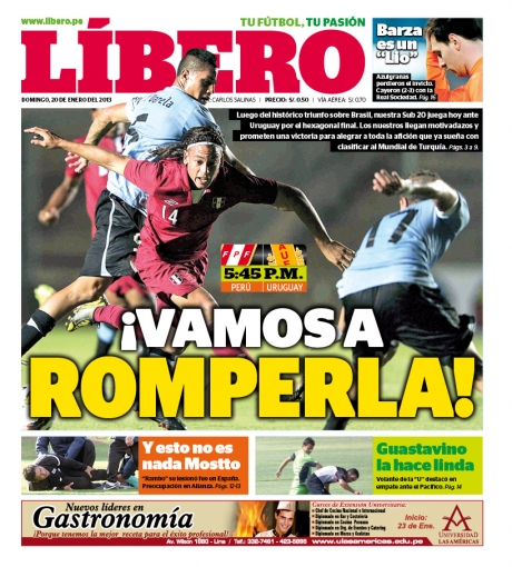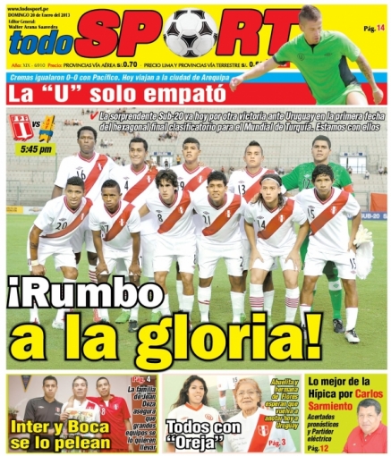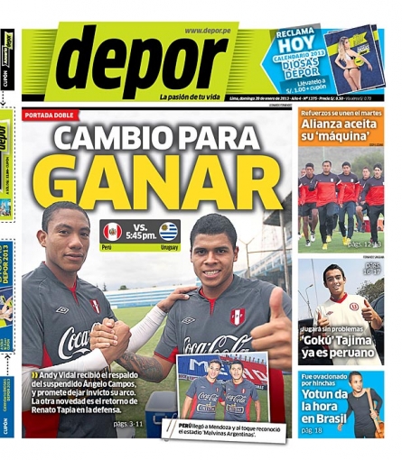 Los principales diarios deportivos del país informan en sus portadas de hoy domingo 20 de enero, del partido que sostendrá la selección peruana de fútbol ante su par de Uruguay, por el Campeonato Sub 20 que se desarrolla en la Argentina.