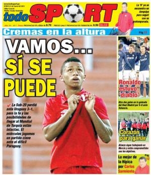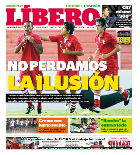Los principales diarios deportivos del país informan en sus portadas de hoy lunes 21 de enero, de la derrota que Perú sufrió a manos de Uruguay por 3 goles a 1, en el comienzo del hexagonal final del Torneo Sub 20 que se realiza en la Argentina.