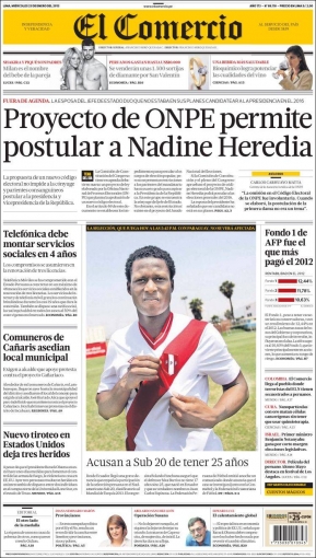 Bajo este mismo rumbo aparece El Comercio. Según el decano de los medios locales, la Comisión de Constitución del Parlamento debatiría en marzo próximo un proyecto de ley realizado por la Oficina Nacional de Procesos Electorales (ONPE), que propone la aprobación de un nuevo código electoral que permitiría la postulación de Heredia Alarcón a las elecciones de 2016.