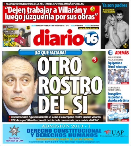 Por su parte, Diario 16 cede interés a lo que sucede en la campaña de revocatoria contra la autoridad edil. El exministro del Interior durante el primer régimen aprista, Agustín Mantilla, se pronunció respecto a la campaña de revocatoria contra la alcaldesa de Lima, Susana Villarán, que el Partido Aprista Peruano (PAP) viene apoyando, señalando que esta decisión trata de reflejar lo que siente la población sobre la actual gestión edil.