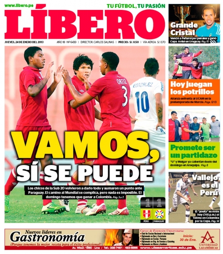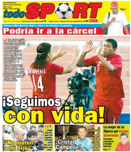 Los principales diarios deportivos del país informan en sus portadas de hoy jueves 24 de enero, de la paridad que cosechó la selección peruana de fútbol con el combinado de Paraguay, en el hexagonal final del Campeonato Sub 20 que se disputa en la Argentina.