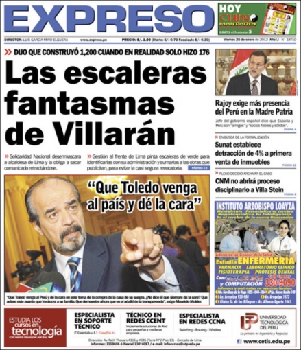 “Las escaleras fantasmas de Villarán”. El titular es de Expreso y se refieren a la burgomaestre de la capital. La exfuncionaria y vocera de Solidaridad Nacional (SN), Patricia Suárez, acusó a la actual gestión edil de engañar a la población limeña con los conocidas “escaleras solidarias”, creadas durante el periodo municipal de su mentor Castañeda Lossio, asegurando que la primera viene repintándolas de color verde para que se identifiquen con su la bancada Fuerza Social, que justamente encabeza la alcaldesa.