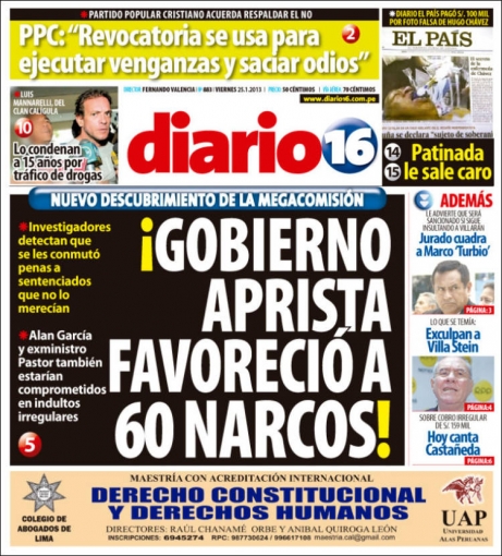 Los casos de corrupción en Perú se hicieron con la primera hoja de Diario 16. La Megacomisión del Congreso que investiga los presuntos actos de corrupción cometidos en el segundo régimen aprista, llamaría a declarar nuevamente al exmandatario Alan García y a su exministro de Justicia Aurelio Pastor a mediados de febrero próximo, para que expliquen las razones por las que dieron 5 mil 14 conmutaciones de penas en su último quinquenio, de las cuales 3 mil 207 son de casos de condenados por tráfico ilícito de drogas.