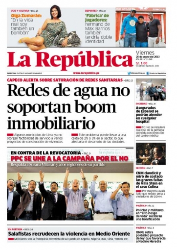 Por su parte, La República concede relevancia el proceso de revocatoria que afronta Lima. El Partido Popular Cristiano (PPC) se mostró en contra de una probable salida de Susana Villarán del sillón municipal de la ciudad, calificando la campaña que se ha iniciado en su contra como “injusta” y que frenará de manera negativa las obras que se han iniciado.