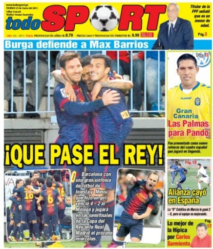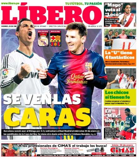 Los principales diarios deportivos del país informan en sus portadas de hoy viernes 25 de enero, sobre el próximo partido que protagonizarán los clubes Real Madrid y FC Barcelona por la semifinal de la Copa del Rey de España.