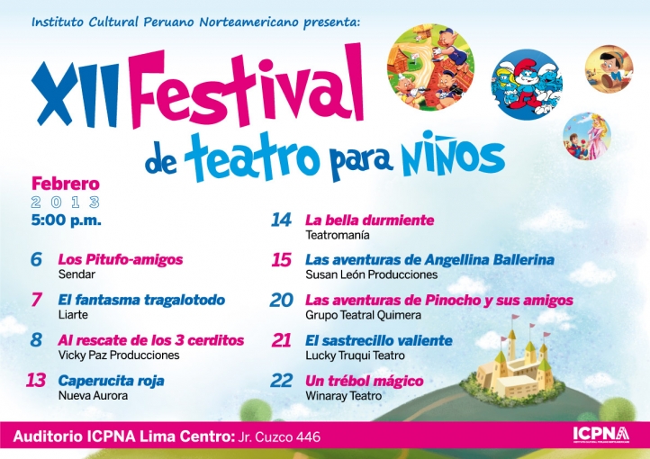 Este ya tradicional espacio creado por el ICPNA es un retorno a la “Tierra de Nunca Jamás” a través de una programación rica y variada, pensada para toda la familia. Las ya reconocidas compañías: Sendar, Liarte, Nueva Aurora, Teatromanía, Susan León Producciones, Grupo Teatral Quimera, Lucky Truqui Teatro y Winaray Teatro pondrán en el escenario sus mejores propuestas dedicadas a los más pequeños. Magnífica oportunidad para disfrutar las vacaciones del verano en compañía de los personajes fantasiosos del lúdico universo infantil. Auditorio ICPNA Lima Centro. De miércoles a viernes, 5:00 p. m. Boletería.