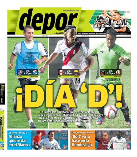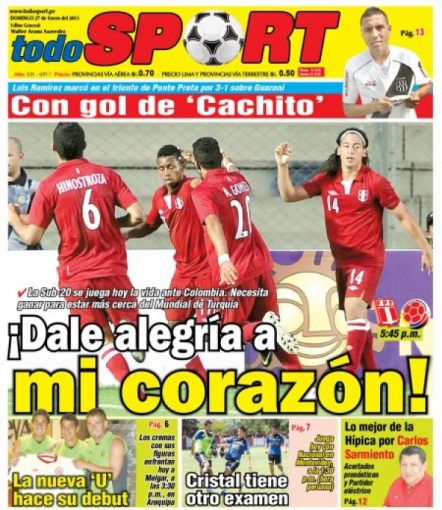 Los principales diarios deportivos del país informan en sus portadas de hoy domingo 27 de enero, sobre el duelo que tendrá hoy la selección peruana de fútbol ante el combinado de Colombia, por la tercera fecha del hexagonal final del Campeonato Sub 20 que se disputa en la Argentina.