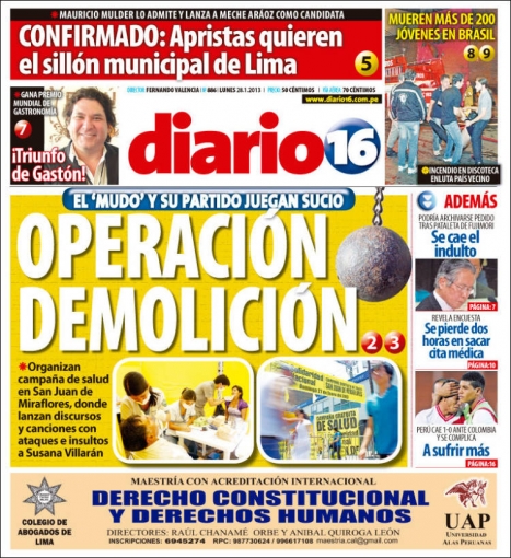 La campaña de revocatoria en Lima llegó a su clímax político, el cual es exhibido y desarrollado por Diario 16. El partido Solidaridad Nacional, que encabeza el exburgomaestre capitalino Luis Castañeda Lossio, ofreció una campaña de salud para los vecinos “más humildes” de San Juan de Miraflores, donde además de brindar atención especializada también se escucharon cántico llenos de insultos contra la actual alcaldesa de la ciudad, Susana Villarán, además de pedir votar por el “SÍ” a su salida en la próxima consulta popular.