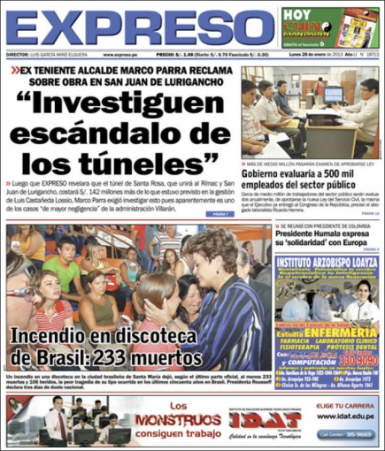 Finalizamos este recorrido con Expreso, que dedica su primera hoja a una investigación sobre los planos de construcción e inversión que demandará el próximo túnel que unirá los distritos del Rímac y San Juan de Lurigancho; mientras que La Razón también hace hincapié en el incendio ocurrido en discoteca de Brasil, que dejó 233 muertos.