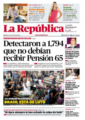 Entre los temas más importantes que muestra la prensa escrita peruana para hoy lunes 28 de enero, resalta la alarmante cifra de 1.794 personas que venían percibiendo el bono que ofrece el programa social Pensión 65, a pesar que su situación económica no les permite calificar para acceder a tal beneficio.