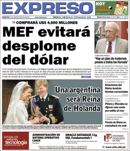 Las temáticas económicas peruanos se hicieron con la primera hoja de Expreso. El máximo responsable del Ministerio de Economía y Finanzas (MEF), Luis Miguel Castilla, comunicó que su portafolio comprará más de 4 mil millones de dólares, con la finalidad de apoyar el trabajo que realiza el Banco Central de Reserva (BCR) y evitar el desplome de la moneda estadounidense.