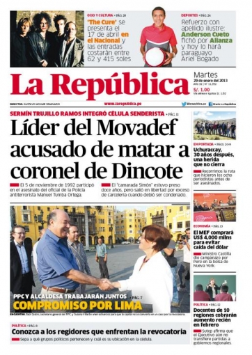 Entre los temas más importantes que muestra la prensa escrita peruana para hoy martes 29 de enero, se encuentra la acusación que pesa sobre Sermín Trujillo Ramos, líder del prosenderista Movimiento por Amnistía y Derechos Fundamentales (MOVADEF), quien presuntamente participó en el asesinato del coronel de la policía antiterrorista de la Dirección contra el Terrorismo (Dincote), Manuel Tumba Ortega, el cinco de noviembre de 1992.