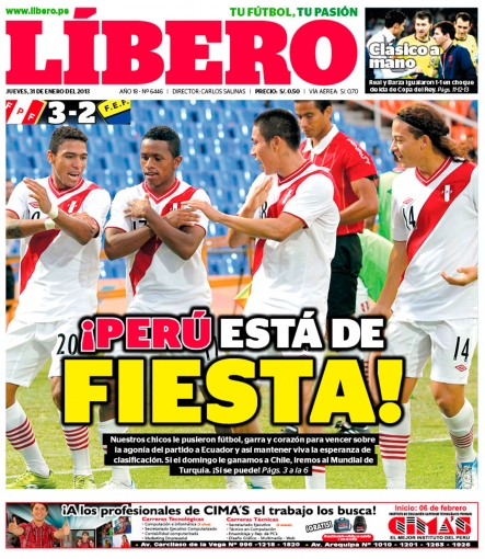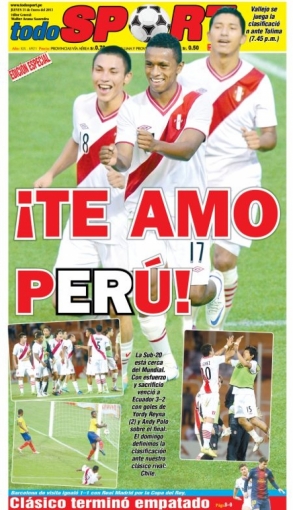 Este resultado se apoderó de la primera hoja de Todo Sport. la selección peruana de fútbol superó por 3 dianas a 2 a Ecuador por la cuarta jornada del Campeonato Sudamericano Sub-20, clasificatorio para el Mundial de Turquía-2013.