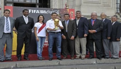 El Presidente de la República, Ollanta Humala Tasso, acompañado por la Primera Dama, Nadine Heredia, participó hoy en la ceremonia de visita de la Copa Mundial FIFA en el Patio de Honor de Palacio de Gobierno.