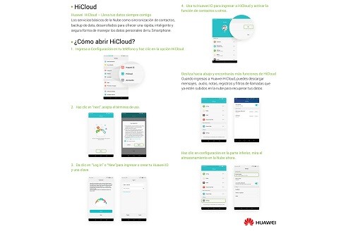 Por otro lado, Huawei también ha desarrollado una aplicación llamada HiCloud (disponible para ciertas actualizaciones de software), que tiene la función de almacenar información del smartphone en la nube Huawei, ya que ofrece 5Gb gratuitos, para que los usuarios siempre puedan tener su información consigo, sin saturar la memoria del teléfono. Además se puede localizar el dispositivo en caso de pérdida. Huawei ha anunciado que hasta el 30 de setiembre, los usuarios tendrán acceso a 5Gb adicionales por 3 meses, solo deben acceder al siguiente enlace https://activity6.hicloud.com/[1]