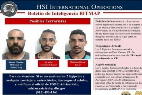 Las identidades de tres de los hombres coincidieron con las de los sospechosos que aparecen en una alerta atribuida a las Investigaciones de Seguridad Nacional de Estados Unidos (HSI) que advierten que tres posibles terroristas han llegado recientemente a América Central.