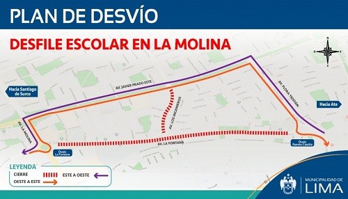 La Municipalidad de Lima informa que este sábado 13 de julio se restringirá el tránsito vehicular en algunas avenidas de La Molina debido a un desfile escolar por Fiestas Patrias.