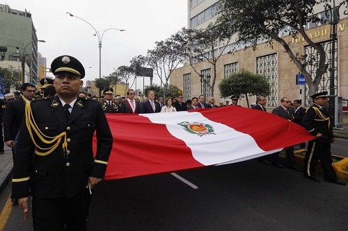 Luego, el burgomaestre dirigió la tradicional procesión de la bandera, la cual continuó por la avenida Nicolás de Piérola hasta llegar a la Plaza San Martín, donde se realizó un homenaje al general don José de San Martín.