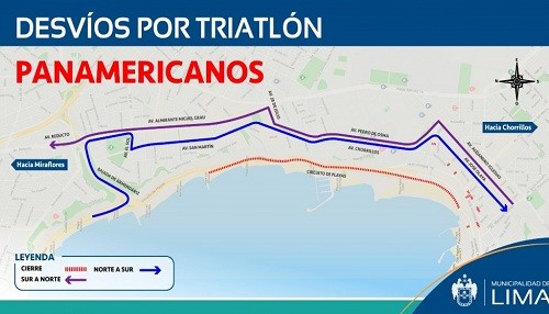 La Municipalidad de Lima informa que desde hoy hasta el 29 de julio se aplicará un plan de desvío en la Costa Verde debido a dos triatlón por los Juegos Panamericanos 2019.
