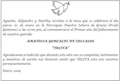 Les hago llegar la participación de la misa de la Madre de nuestro amigo Agustín Collazos G., al cumplirse un año de su fallecimiento. Espero vuestra participación en este acto eclesiástico, acompañando a Tin y familia. Un abrazo.