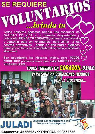 “ENCLAVE JUVENIL” pueden Inscribirse al Correo electrónico juladi.lima.peru@gmail.com o ponerse en contacto a los siguientes números: 990150042 - 997958087. y si no deseas participar en forma activa puedes hacerlo ayudando con ropas, calzados, frazadas, útiles escolares o de aseo personal entre otras cosas.