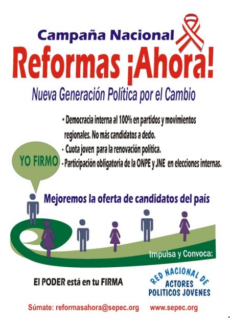 2. Reformas ¡Ahora!Propone que esta generación y las que vienen no posterguen la aplicación de la democracia en todas las esferas de la vida política peruana, su no aplicación es una de las fuentes de corrupción. Por esta razón ingresan personas por la ventana sin haberse ganado por meritocracia este derecho de representación.