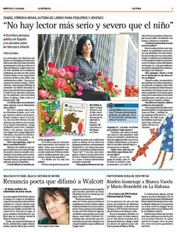 Los personajes y las historias que fluyen de su imaginación hacia sus libros para niños y jóvenes sin duda provienen de la vida que vivió en el valle del Mantaro, lugar donde nació. Pero también de su residencia en Madrid, que data de 1986. Isabel Córdova Rosas es una importante escritora de libros para niños, una verdadera best- seller. Como pocos autores de nuestro tiempo, Córdova Rosas –antropóloga y filóloga de profesión– ha sabido sintonizar el gusto y la atención de los pequeños a través de sus historias y personajes. Ha publicado cerca de treinta libros, el último, Tinko y Gabi en el Amazonas (Ed. SM)