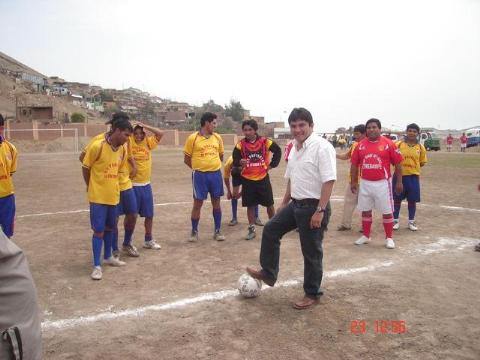 A continuación el Alcalde Jorge Pretell fue invitado a dar el play de Honor; acto seguido se inició el encuentro entre el Equipo Municipal, a cargo de la dirección técnica del Alcalde Municipal, y un combinado de la asociación de mototaxistas, quienes vendieron cara su derrota.