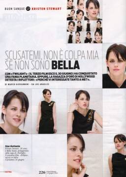 Las primeras preguntas tratan sobre el inminente estreno de Eclipse, la tercera entrega de la saga Crepúsculo que se estrenará en los cines el próximo 30 de junio. Kris cuenta todos los cambios que Bella deberá afrontar en esta película y las decisiones que deberá tomar, cambiando por completo su vida. Partiendo de Eclipse, la joven estrella vuelve la mirada atrás hasta los 17 años y cuenta como fue elegida para interpretar al personaje principal de la serie, que nunca habría podido imaginar que seguiría allí hasta los 22 años (actualmente solo tiene 20). Aunque la madre de Kristen trabajaba en la industria del cine, su carrera empezó un poco por casualidad, cuando un cazatalentos de Los Angeles se fijó en ella durante una obra de Navidad del colegio, cuando Kris tenía solo 8 años. Empezó a hacer castings por la ciudad hasta que le llegó la oportunidad de interpretar el papel de la hija de Jodie Foster en la película La habitación del pánico (con Jared Leto), a partir de ahí su carrera no ha parado de crecer. De vuelta al presente, la actriz decide aclarar algunos malentendidos que circulan sobre ella y sobre su carácter reservado, por ejemplo, se dice que a Kristen lo le importan nada ni Crepúsculo ni sus fans. Kris declara que estas cosas la enfurecen y explica que la razón por la que a veces se comporta fría y distante se debe simplemente al hecho de que no siempre se siente cómoda debajo de los focos. A pesar del gran éxito conseguido, esta joven actriz intenta llevar una vida modesta y dice no sentirse como un modelo a seguir. Además, añade que, siendo una actriz, se limita a interpretar los personajes que le ofrecen, ya sean Bella Swan o Joan Jett, y que por este motivo no consigue entender el porqué de este interés por ella o por su vida privada.En resumen, Kristen ha demostrado ser una chica con los pies en el suelo, que intenta vivir una vida lo más normal posible y mantener el trabajo y la fama separados de su vida de veinteañera.Fuente: Fansblog