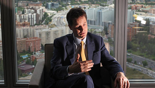 Clegg, que habla cinco idiomas, entre ellos un español magnífico, recibe a EL PAÍS en un hueco de sus apenas 48 horas en Madrid y el día que comienza el Mundial de Fútbol. "Tendré que convencer a mis hijos de que vamos con Inglaterra", bromea.