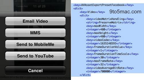 Sin embargo ahora que el iOS 4 está a punto de salir se han encontrado ciertas nuevas porciones de código que permitirían exportar vídeo directamente a Facebook, tal y como ya podemos hacer con YouTube o con las galerías MobileMe de Apple. En el código podemos ver la resolución y otras propiedades a las que el vídeo se exportaría para ser después enviado a la mayor red social del mundo.