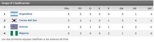Habiendo concluido la segunda fecha de los 16avos del final del Grupo B, la selección de Argentina lidera la tabla de posiciones con 6 puntos producto de sus victorias frente a Nigeria (1 – 0) y a Corea del Sur (4 – 1). Con los 6 puntos que ha obtenido el combinado sudamericano, es el único equipo hasta el momento que se ha clasificado para los 8avos del final en este torneo. En segundo lugar, solo por cuestión de diferencia de goles en relación a Corea del Sur, se encuentra con 3 puntos el once griego obtenidos luego de vencer al equipo de Nigeria por 2 – 1. En tercer lugar, encontramos al equipo sudcoreano con el mismo número de unidades, pero con un gol menos a favor que los griegos. En último lugar, sin ningún punto y con 2 goles en su pasivo, se encuentra el equipo de Nigeria.