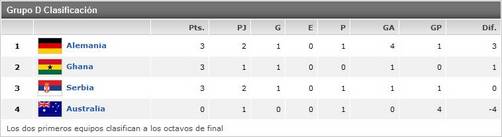 Faltando un partido para completar la segunda fecha de los octavos del final en este grupo, Alemania, Ghana y Serbia tienen 3 puntos cada uno, luego de la sorpresiva victoria que ha obtenido el cuadro serbio contra el equipo de Alemania en el primer pardtido jugado el 18 de junio. Queda por jugar el segundo match de esta fecha entre los combinados de Ghana y Australia el 19 de junio a las 16 pm. hora local.