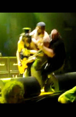 Lejos de cancelar el show o pararlo, como, seguramente, sí hubiera hecho Axl Rose, el músico siguió adelante con su presentación entre la ovación de su público. Si bien el incidente se produjo el jueves pasado, las imágenes salieron a la luz recién en las últimas horas gracias a la grabación que hizo un espectador, donde se ve claramente que un apasionado fanático sale desde atrás del escenario para abalanzarse sobre Slash, quien logra zafarse y coge su guitarra a tiempo antes de que ésta caiga al suelo. Slash casi cae violentamente al suelo, pero rápidamente logró incorporarse a la música para continuar tocando el tema arriba mencionado. Por su parte, el agresor fue reducido por el equipo de seguridad, que lo retiró del evento.Fuente: Terra