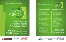 PRODUCE - Ministerio de la Producción, CONAPISCO - Comisión Nacional del Pisco y la MUNICIPALIDAD DE SANTIAGO DE SURCO se unen en el acontecimiento: "Festival Pisco Surco 2009: Nuestra Patria, Nuestra Fiesta, Nuestro Pisco"; reuniendo a productores y distribuidores de diferentes ciudades, quienes ponen sus conocimientos a la orden del público asistente, ofreciendo para degustación y venta a precios de fábrica las diversas variedades de: Pisco Puro: Elaborado de uvas no aromatizadas, quebranta, mollar o negra corriente. Pisco Aromático: Elaborado con uvas italia y moscatel que son aromáticas y existen en sub-tipos como la Italia, Moscatel de Alejandría, Torontel o Albilla. Pisco Mosto Verde: Obtenido de la destilación de caldos incompletamente fermentados. Pisco Acholado: Proveniente de la mezcla de caldos de distintas variedades de uva. Ceremonia ha desarrollarse del Viernes 17 al Domingo 19 de Julio en la Plaza de Armas (Surco Pueblo); rindiendo el homenaje a nuestra bebida de bandera.