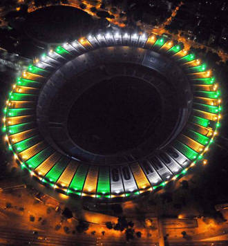 La estatua Bellini, en la entrada principal del estadio, tendrá también una iluminación 'verde amarela' durante toda la época del mundial sudafricano.