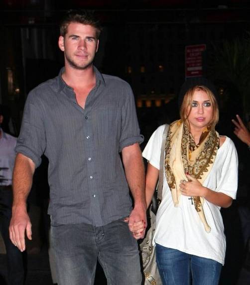 Miley Cyrus y su novio Liam Hemsworth son todo sonrisas mientras se toman de la mano al salir de su hotel en New York City, NY el 17 de junio a comer en TAO restaurante cercano.