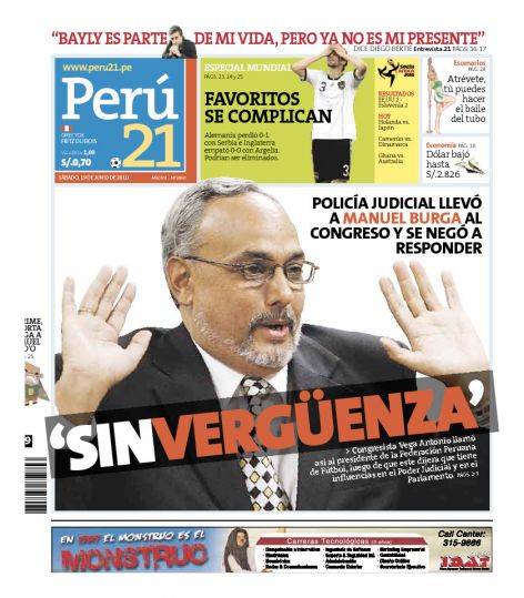 Lo llevaron a la fuerza, se peleó con los congresistas, no respondió preguntas, lo llamaron “sinvergüenza” y se fue como si nada hubiera pasado. El presidente de la Federación Peruana de Fútbol, Manuel Burga Seoane, protagonizó un bochornoso espectáculo al tener que ser conducido por la Policía Nacional ante la comisión parlamentaria que investiga las irregularidades en el deporte, que preside Renzo Reggiardo, para que respondiera a las imputaciones formuladas en su contra por los delitos de lavado de dinero y apropiación de recursos que deberían destinarse para el Fondo Pro Deporte Escolar.Lo sucedido ayer tiene una connotación histórica. Es la primera vez, desde 1980, que una comisión legislativa recurre a las fuerzas del orden para conducir de grado fuerza a una persona.A la hora prevista, 11:00 a.m., un agente de la Policía Judicial informó a los miembros de la comisión que se había cumplido con el mandato de llevar a Burga hasta esa instancia. A los pocos minutos, el dirigente deportivo ingresó a la sala de sesiones y, tras jurar ante una cruz y una Biblia, precisó que ejercería su derecho de no responder sobre los temas de fondo.Burga resaltó lo que llamó logros de su gestión, como la clasificación al Mundial Sub 17 o el saneamiento de las cuentas de la federación. Aseguró que no lo podían investigar porque no es funcionario público. Sin embargo, Reggiardo le recordó que la FPF maneja fondos públicos y está sometida al control estatal por mandato del Tribunal Constitucional.Pero también dijo que tiene influencias en el Poder Judicial, en la Policía Nacional y en el propio Congreso, y que está al tanto de cada paso que dan sus opositores.“SINVERGÜENZA”. La sesión fue tensa. Burga señaló que no tenía problemas personales con ningún parlamentario, salvo con el titular de la comisión, quien ha montado –afirmó– una campaña de persecución en su contra. Sostuvo que la investigación se sustenta en suspicacias y que, con ese mismo criterio, Reggiardo podría ser investigado por unos contratos de publicidad en campaña en los que está involucrada su esposa. El fujimorista expresó que se sometía a cualquier investigación y lamentó el proceder del dirigente.Pero el momento de mayor conflicto fue cuando José Vega Antonio, presidente de la Comisión de Fiscalización, intervenía y el dirigente lo interrumpió con unos movimientos de mano. El legislador le llamó la atención por su actitud. “No está en la federación, aquí se respeta. Usted es un sinvergüenza”, enfatizó.Burga siguió con el libreto provocador y llegó a pedir que Reggiardo bajara el tono de voz cuando se dirigiera a él. Hasta comentó que el Congreso tiene mala popularidad. Isaac Mekler le aclaró que, a diferencia de él, los legisladores dan siempre la cara.Vía Perú21