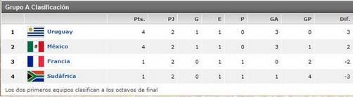 Habiendo concluido la segunda fecha de los 16avos del final del Grupo A del Mundial Sudáfrica 2010, Uruguay encabeza la tabla de posiciones con 4 puntos producto de su empate con Francia (0 – 0) y la contundente victoria obtenida contra el combinado sudafricano (3 – 0).En segundo lugar se sitúa el equipo mexicano que aunque también tiene 4 puntos obtenidos gracias a su empate con Sudáfrica (1 – 1) y de la sorpresiva victoria obtenida contra el combinado francés (2 – 0), detenta un gol a favor menos que el once uruguayo.Finalmente, en la cola de la tabla, Francia y Sudáfrica, cada uno con un punto... esperando el milagro, pues para que alguno de ellos pueda clasificarse, en el otro partido tendría que perder abultadamente. Ya que en caso de un empate entre México y Uruguay, sea cual sea el resultado entre Francia y Sudáfrica, los dos primeros equipos se clasificarían. Próximos partidos: 22/06 16:00 Rustenburgo: México Vs. Uruguay 22/06 16:00 Mangaung / Bloemfontein : Francia Vs. Sudáfrica