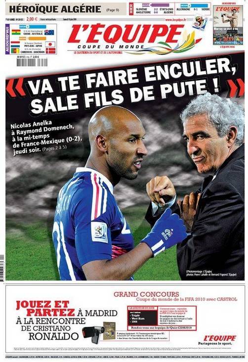 Las semanas previas al Mundial, Domenech decidió no incluir en su grupo a: tres excelentes jugadores de origen magrebí: Samir Nasri (Arsenal), Karim Benzema (Real Madrid) y Hatem Ben Arfa (Marsella), prefiriéndoles a jugadores que no rindieron para nada en Sudáfrica, a saber respectivamente Sindney Govou, Nicolas Anelka y Mathieu Valbuena. El origen norafricano de los tres jugadores descartados alimentó la sospecha de que la decisión fue inspirada por el clan "africano" de la selección...Leer más en rfi