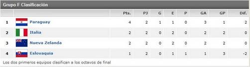 Paraguay, gracias a su empate (1-1) ante Italia en la primera fecha y a su triunfo (2-0) frente a Eslovaquia, lidera con 4 puntos este grupo. Le sigue con igual cantidad de puntos (2) y diferencia de goles los combinados de Italia y Nueva Zelandia. En la cola, se encuentra el once de Eslovaquia con un solo punto obtenido producto del empate (1-1) ante Nueva Zelandia en la primera fecha, pero con menos dos goles como pasivo. La tercera fecha de los 16avos del final en este grupo se anuncia dramática, ya que ninguno de los combinados esta por el momento impedido de pasar a la siguiente fase del torneo. Incluso el once de Eslovaquia podría clasificarse si vence al combinado italiano, cosa que constituiría una gran sorpresa, y el favorito Paraguay vence al relativamente discreto conjunto neozelandés. Nada, entonces está dicho en este grupo. Aunque lo previsible es que Paraguay e Italia clasifiquen.Próximos partidos: 24/06 16:00 Johannesburgo – JEP: Eslovaquia Vs. Italia 24/06 16:00 Polokwane: Paraguay Vs. Nueva Zelanda