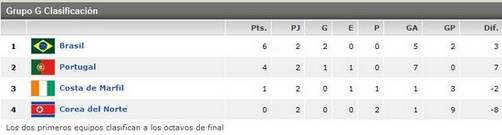 Finalizada la segunda fecha de los 16avos del final de este Grupo de Sudáfrica 2010, Brasil con 6 puntos encabeza la tabla de posiciones de su grupo gracias a sus sendos triunfos sobre la República de Corea (2-1) y Costa de Marfil (3-1). En segundo lugar viene el equipo de Portugal, el que gracias a los 7 goles que marcó en portería de la República de Corea, se encuentra practicamente clasificado, debido a la diferencia de goles con respecto a Costa de Marfil. La suerte parece está echada en este grupo, pues Costa de Marfil tendría que golear a Cora del Norte y esperar que Brasil golee también a Portugal a fin de clasificarse: Costa de Marfil tendría que ganarle por lo menos por 3 goles de diferencia a la Republica de Corea y Brasil tendría que golear (por ejemplo) 7 a Portugal... Próximos partidos:Próximos partidos: 25/06 16:00 Durban: Portugal Vs. Brasil 25/06 16:00 Nelspruit: RDP de Corea Vs. Costa de Marfil